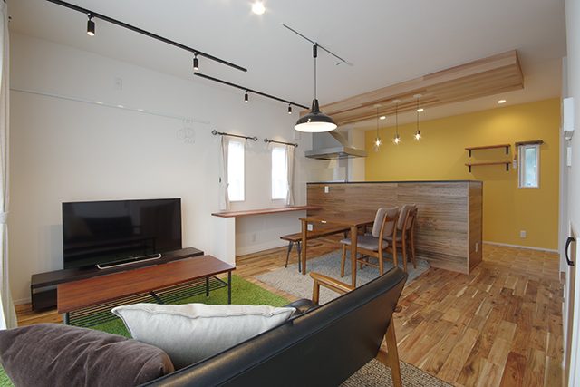 全体のテーマは「おしゃれなカフェ空間」!リビングのアクセントクロスや、照明、アイアン調の金具使い、窓の格子等ひとつひとつ細部までこだわり、リアルなカフェスペースを演出。また、キッチン周りを中心に、壁面には無垢パネル、折下天井部分にレッドシダー、漆喰壁を採用したりと自然素材をふんだんに取り入れております。